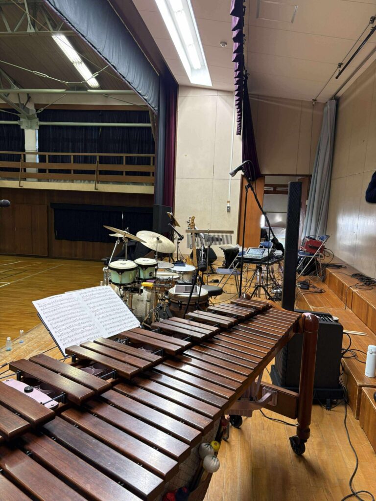 小学校でジャズやラテンの楽しさ、音楽の楽しさを味わってもらう鑑賞会。学校の体育館に楽器、音響設備をセッティングします。(朝はやい😅)